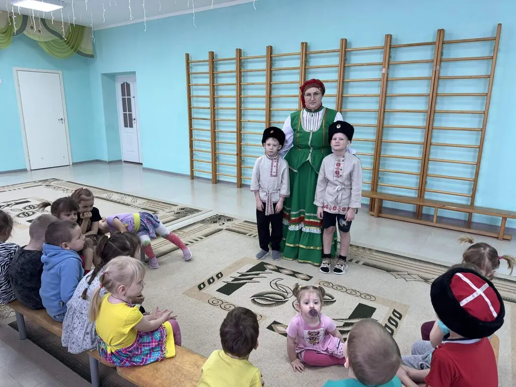 Ведущая Татьяна Валерьевна рассказала об укладе жизни казаков, об их традициях и ценностях. Подробно рассказала и продемонстрировала повседневный и праздничный наряд женщины-казачки и казачат.